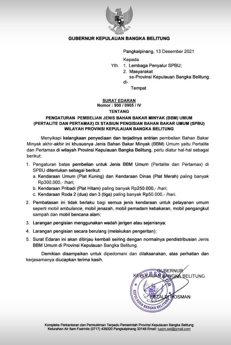 Tentang Pengaturan Pembelian Jenis Bahan Bakar Minyak (BBM) Umum (Pertalite dan Pertamax) Di Stasiun Pengisian Bahan Bakar Umum (SPBU) Wilayah Provinsi Kepulauan Bangka Belitung